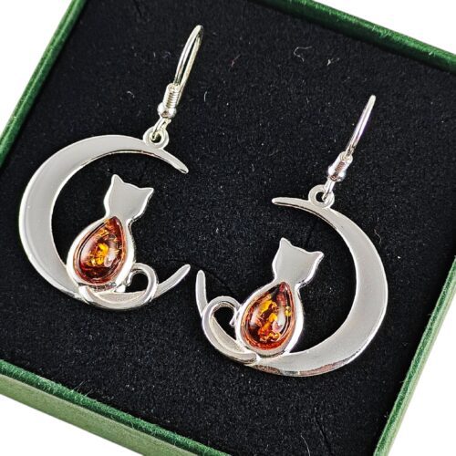 Kolczyki srebrne z bursztynem – Kot na księżycu