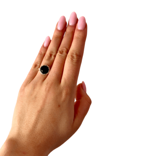 PIERŚCIONEK SREBRNY REGULOWANY Z ONYKSEM – OKRĄGŁY – SREBRO 925