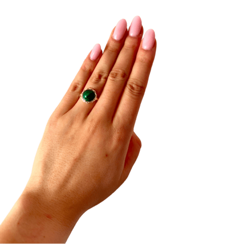 PIERŚCIONEK SREBRNY REGULOWANY Z MALACHITEM – OKRĄGŁY – SREBRO 925