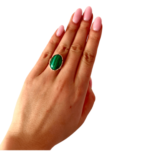 PIERŚCIONEK SREBRNY REGULOWANY Z MALACHITEM – OWALNY KORONKOWY – SREBRO 925