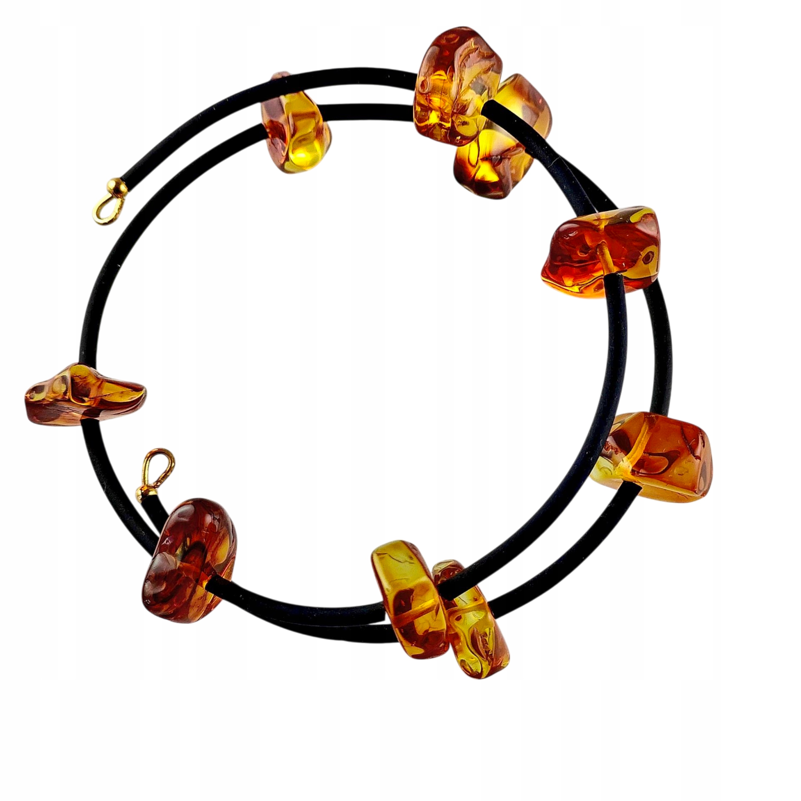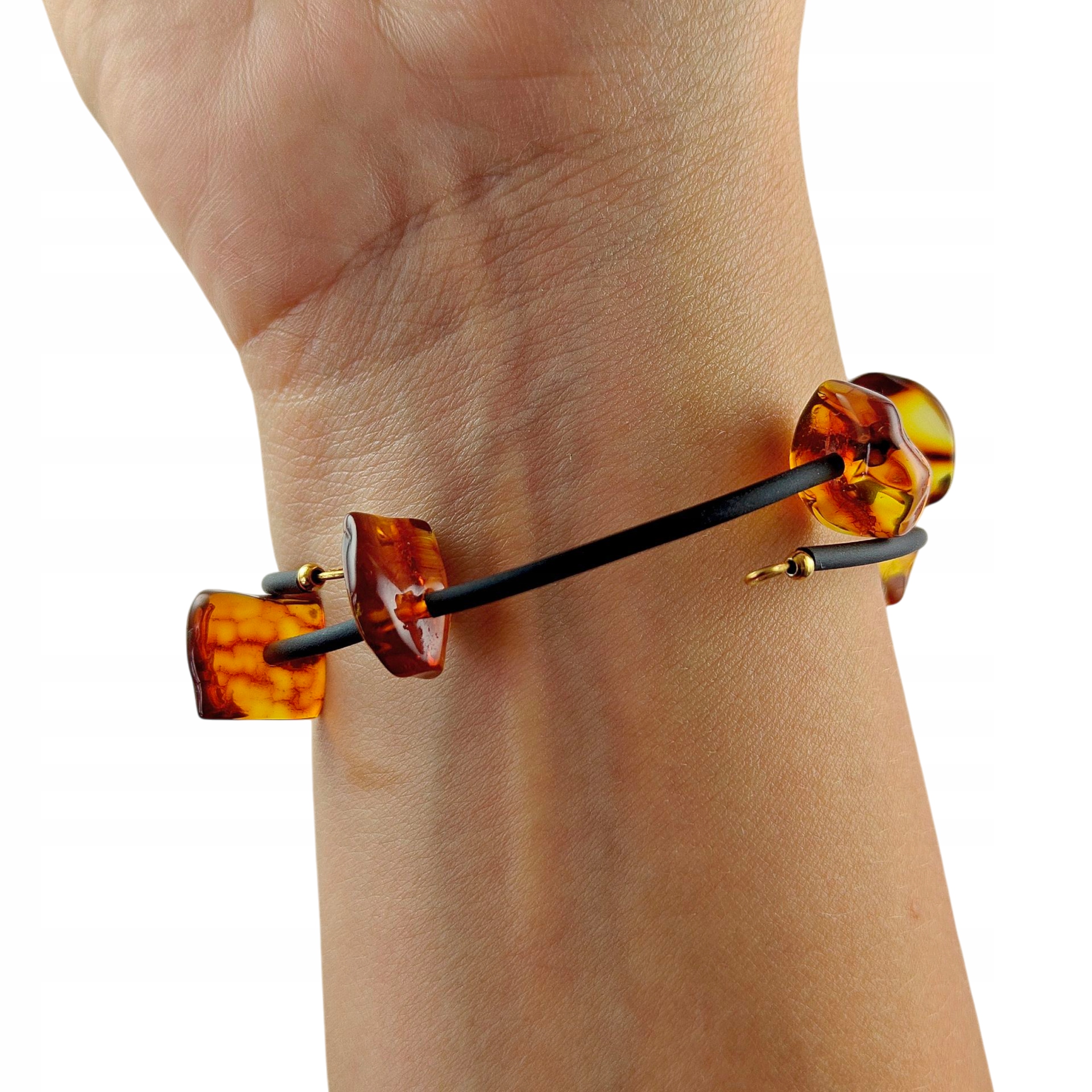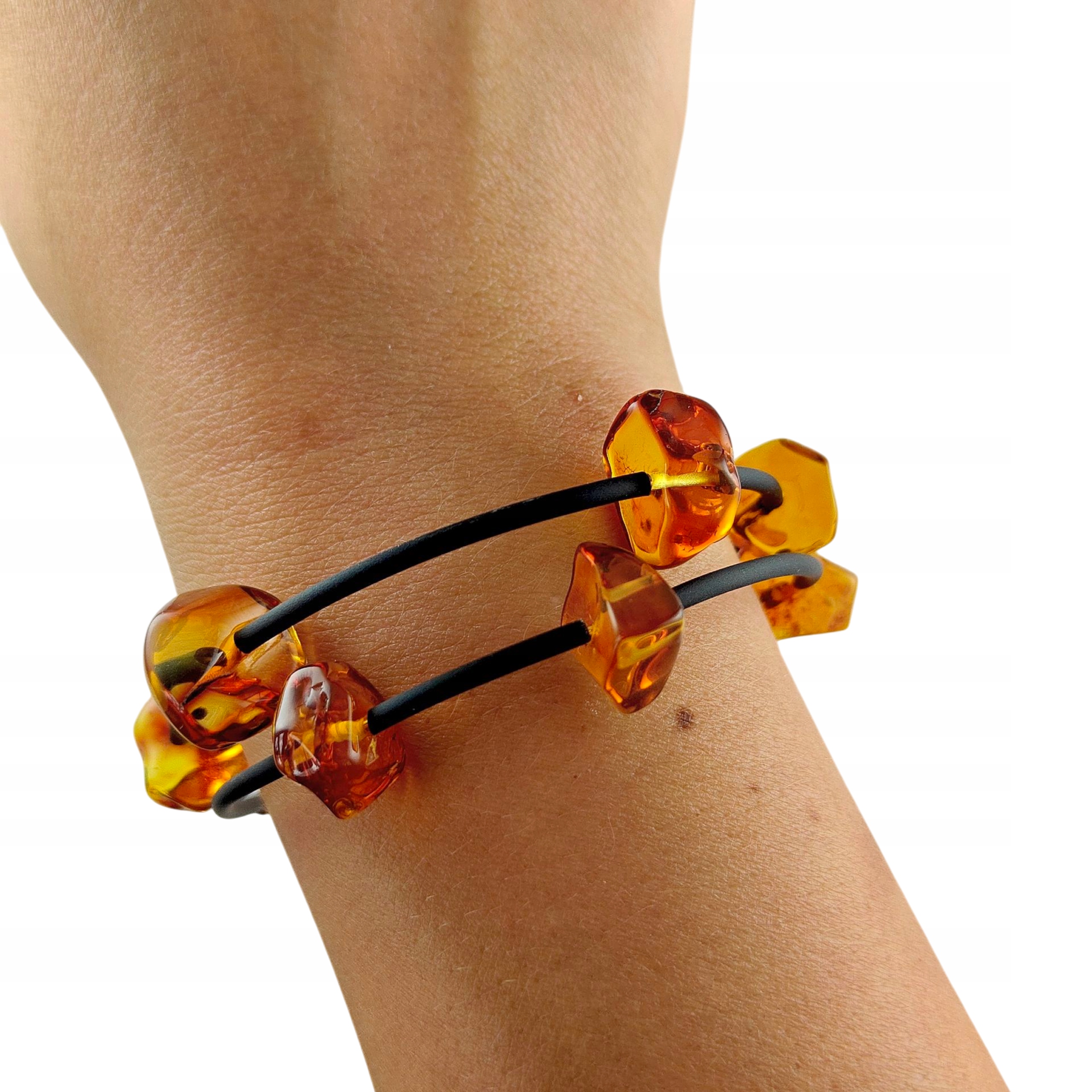 ✔️ Kolor bursztynu – Koniak – Bursztyn nawleczono na sprężysty drut stalowy, który został pokryty czarną gumką silikonową. Drut jest elastyczny, dzięki czemu dopasuje się do każdej ręki.