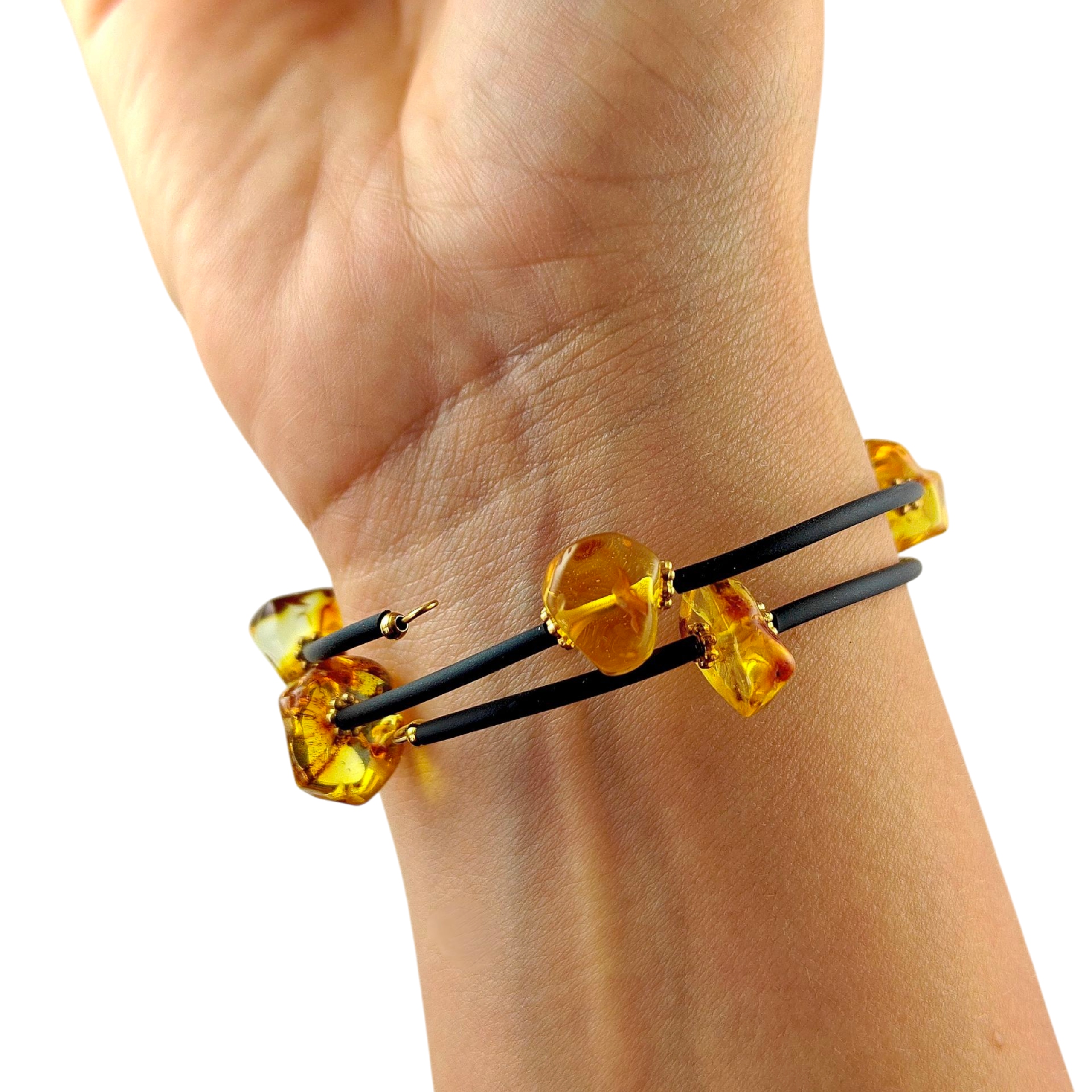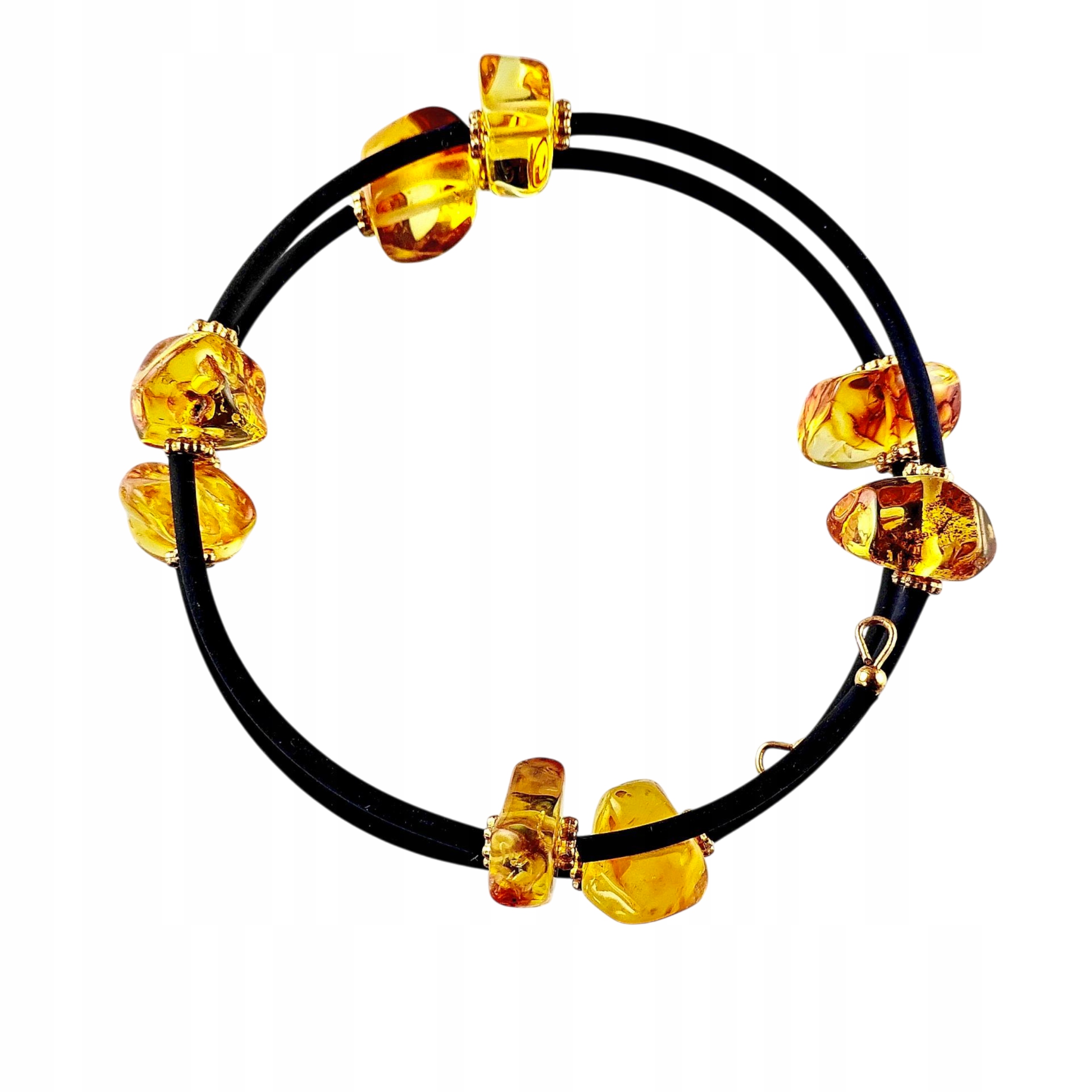 ✔️ Kolor bursztynu – Koniak – Bursztyn nawleczono na sprężysty drut stalowy, który został pokryty czarną gumką silikonową. Drut jest elastyczny, dzięki czemu dopasuje się do każdej ręki.