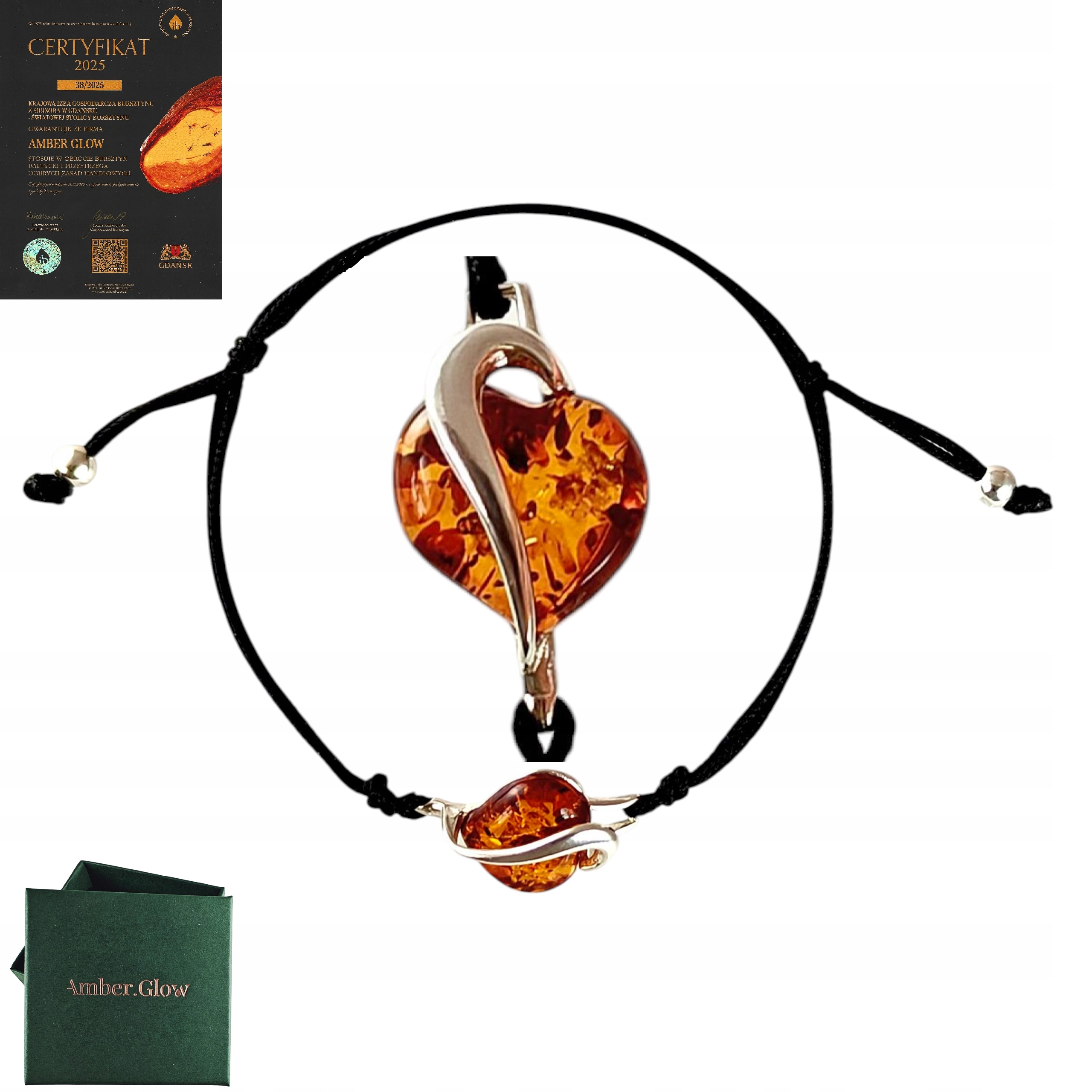 BRANSOLETKA SREBRNA na Sznurku SERCE z CERTYFIKOWANYM Bursztynem ŚLICZNE