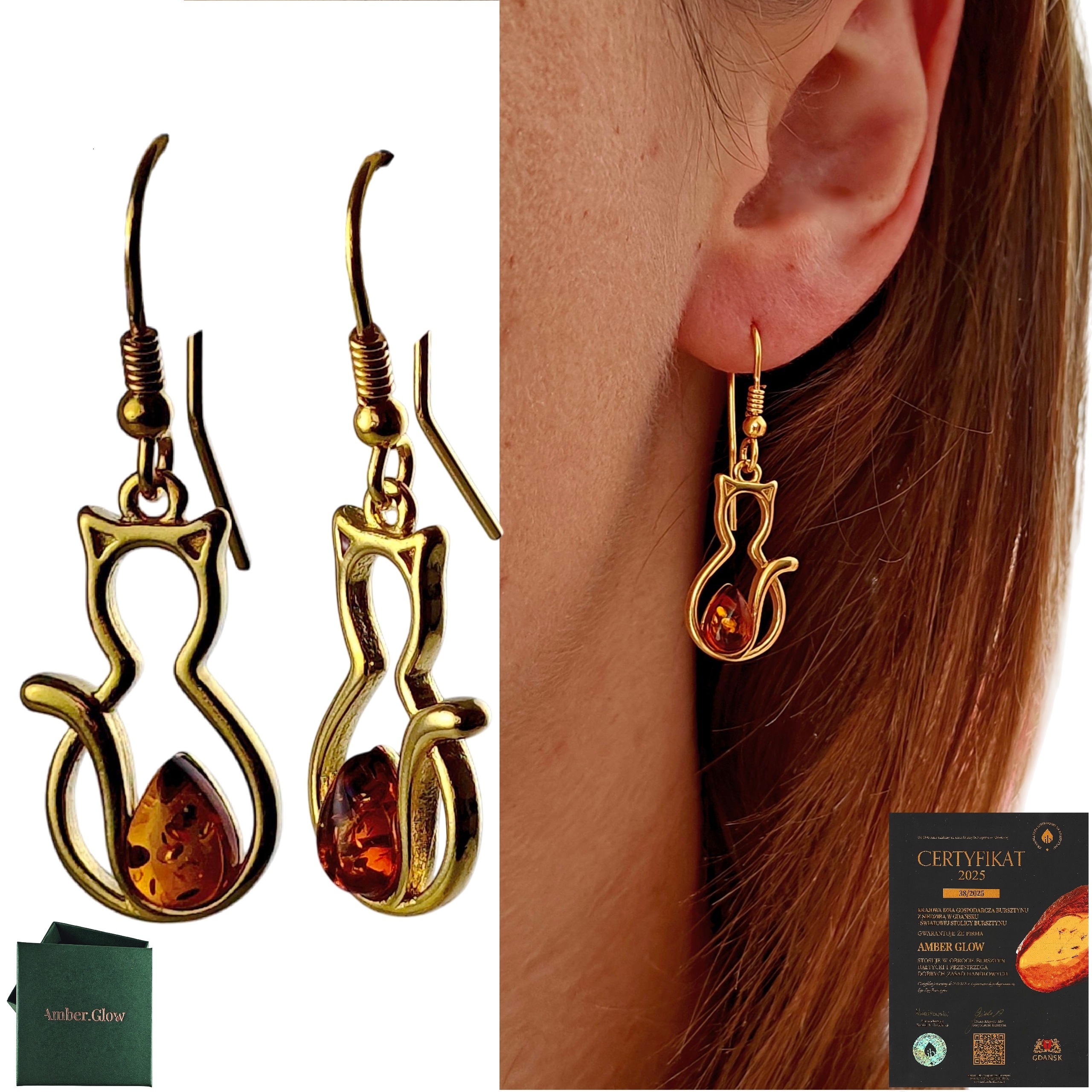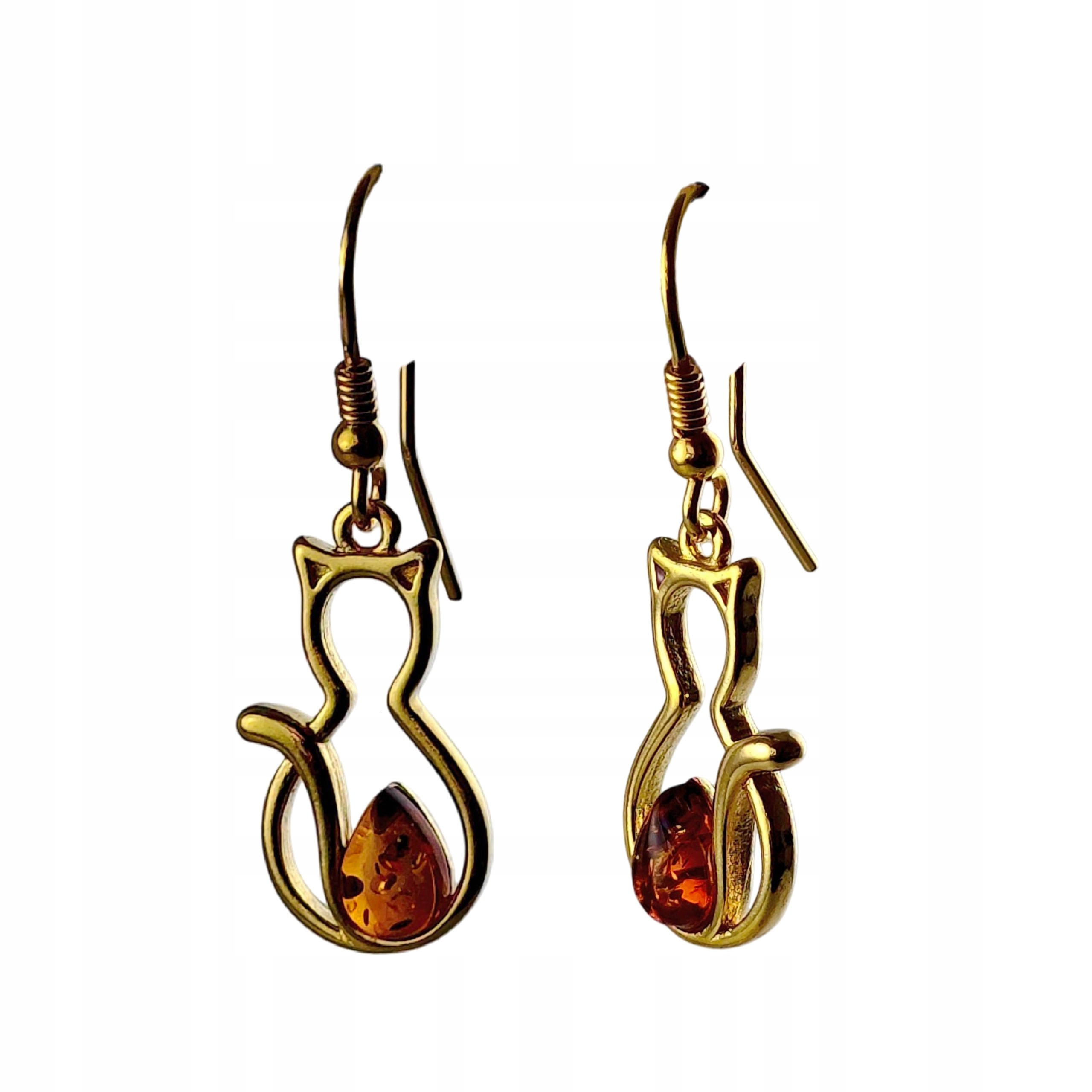 KOLCZYKI ZŁOTE KOTY z CERTFIKOWANYM Bursztynem ŚLICZNE Srebro Pozłacane