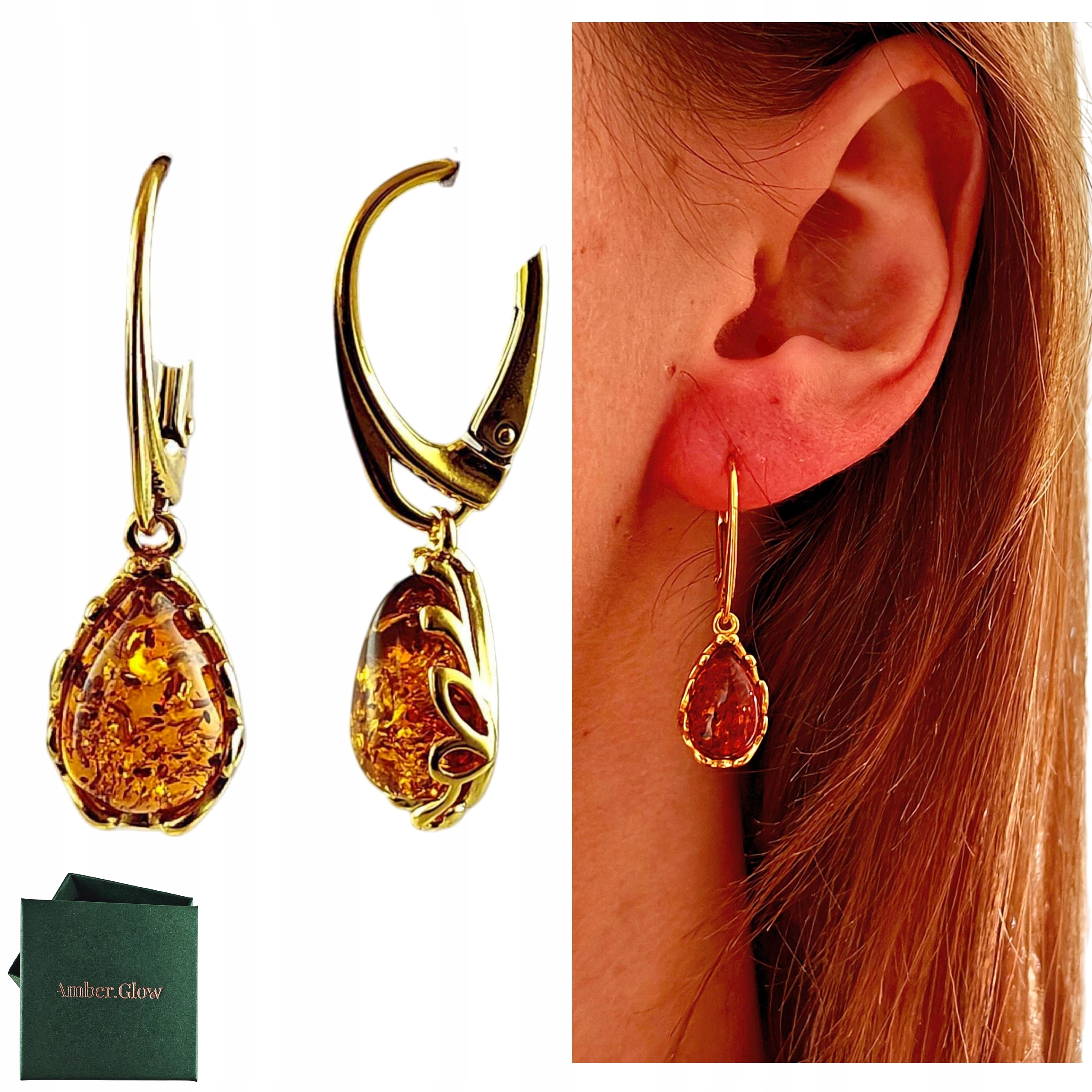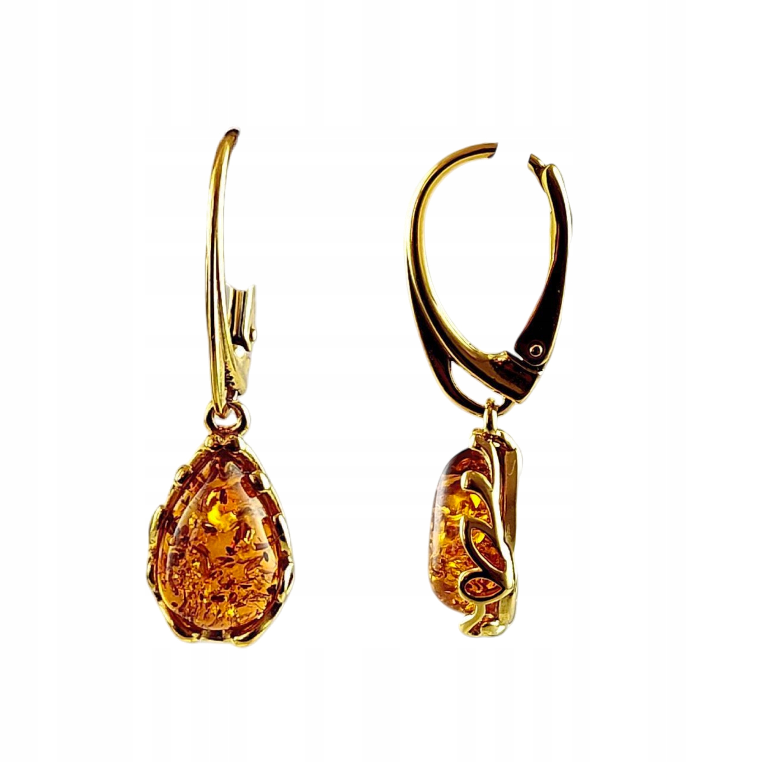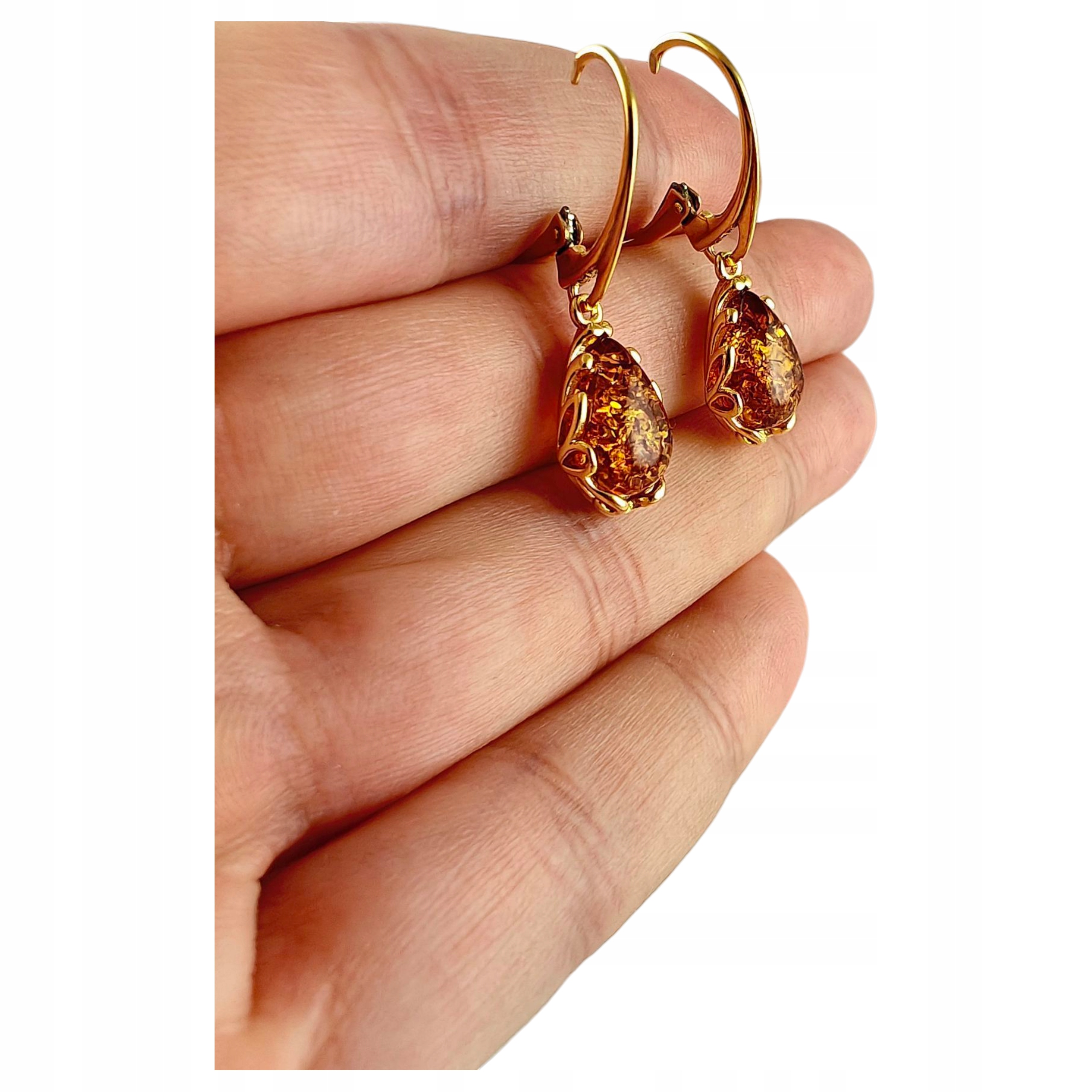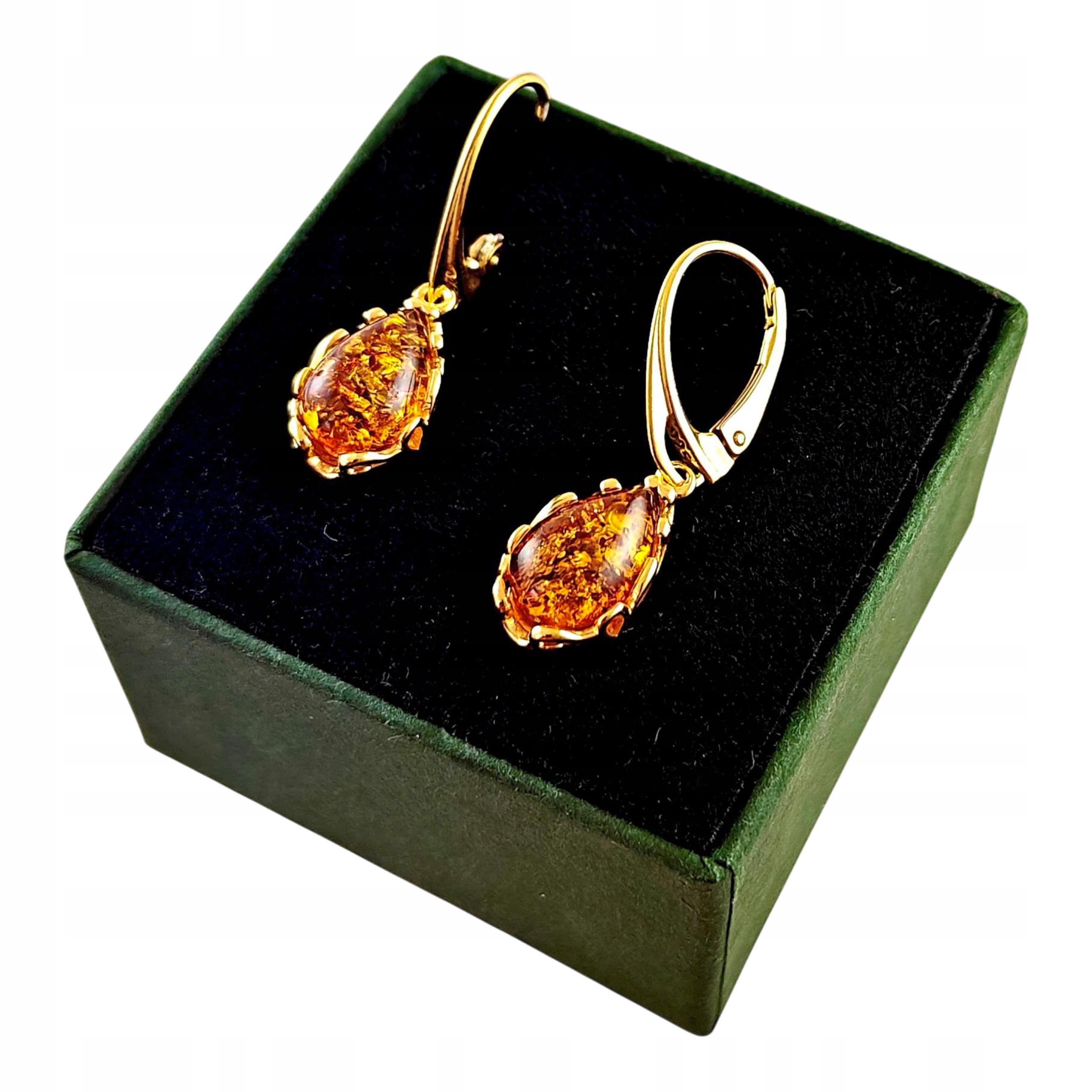 KOLCZYKI ZŁOTE z CERTYFIKOWANYM Bursztynem WISZĄCE PIĘKNE Srebro Pozłacane
