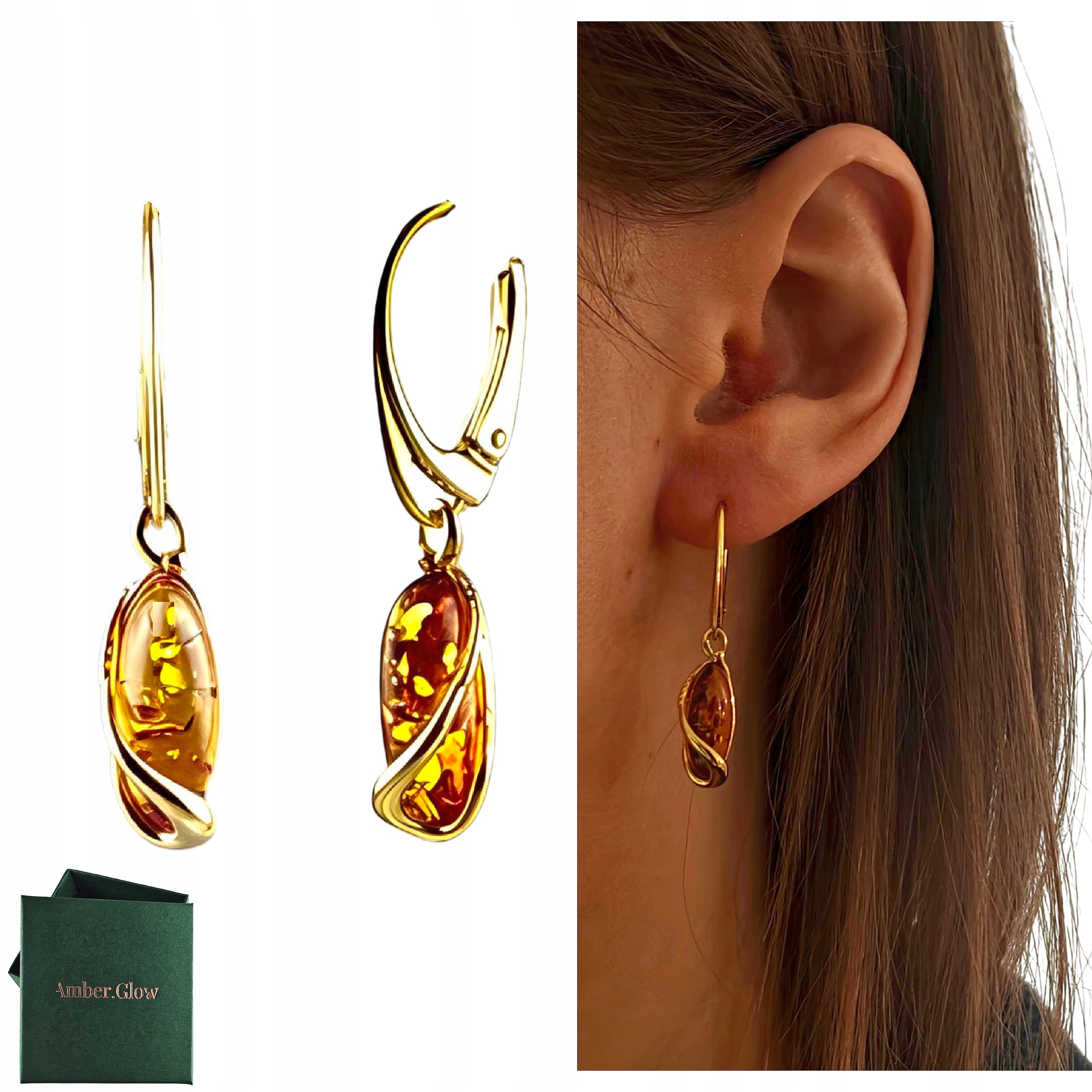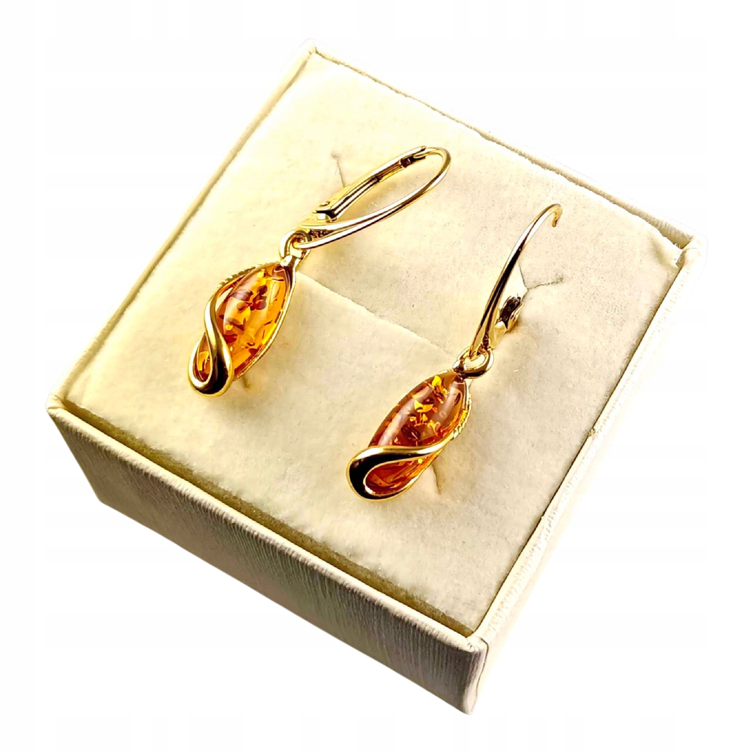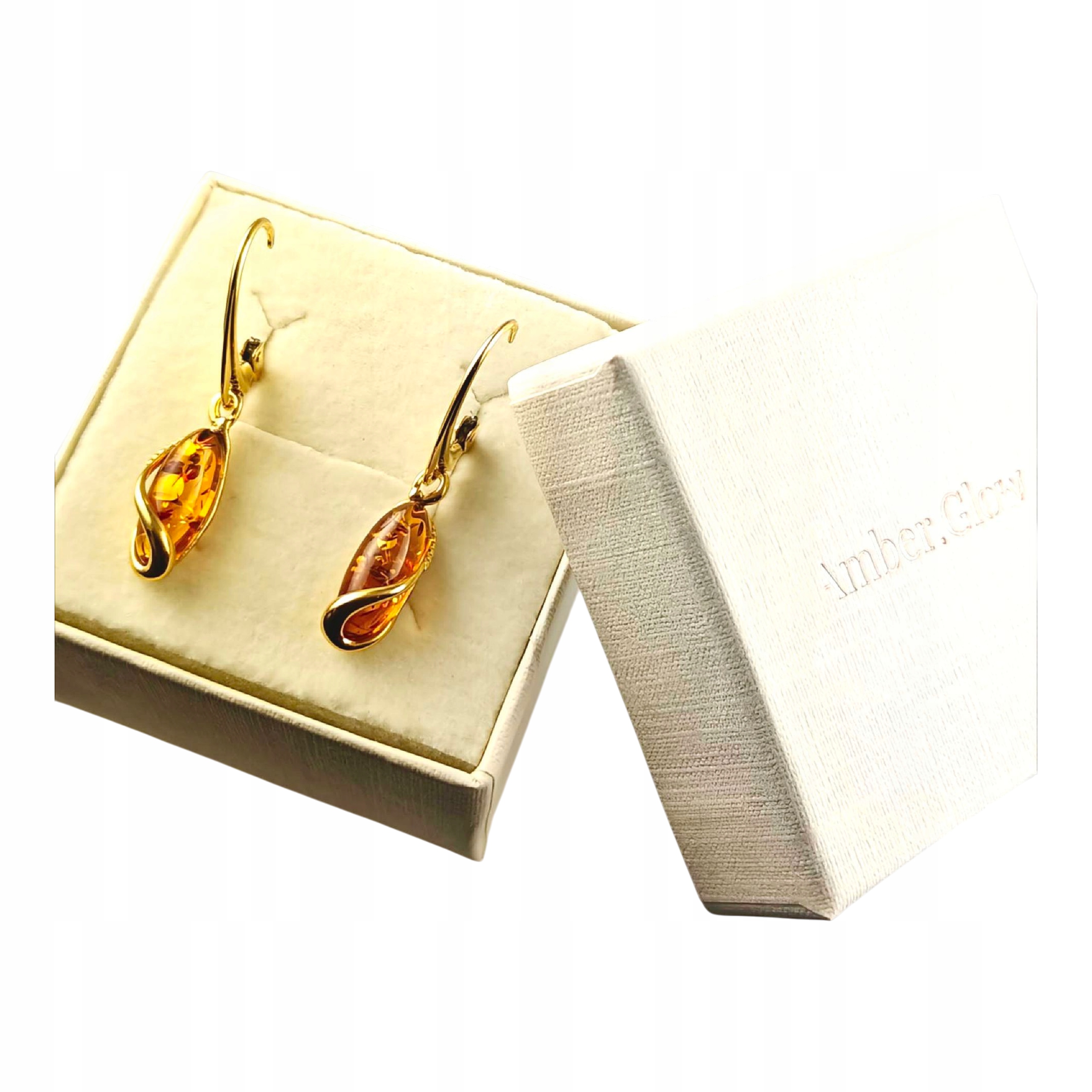 KOLCZYKI ZŁOTE z CERTYFIKOWANYM Bursztynem WISZĄCE PIĘKNE SREBRO POZŁACANE