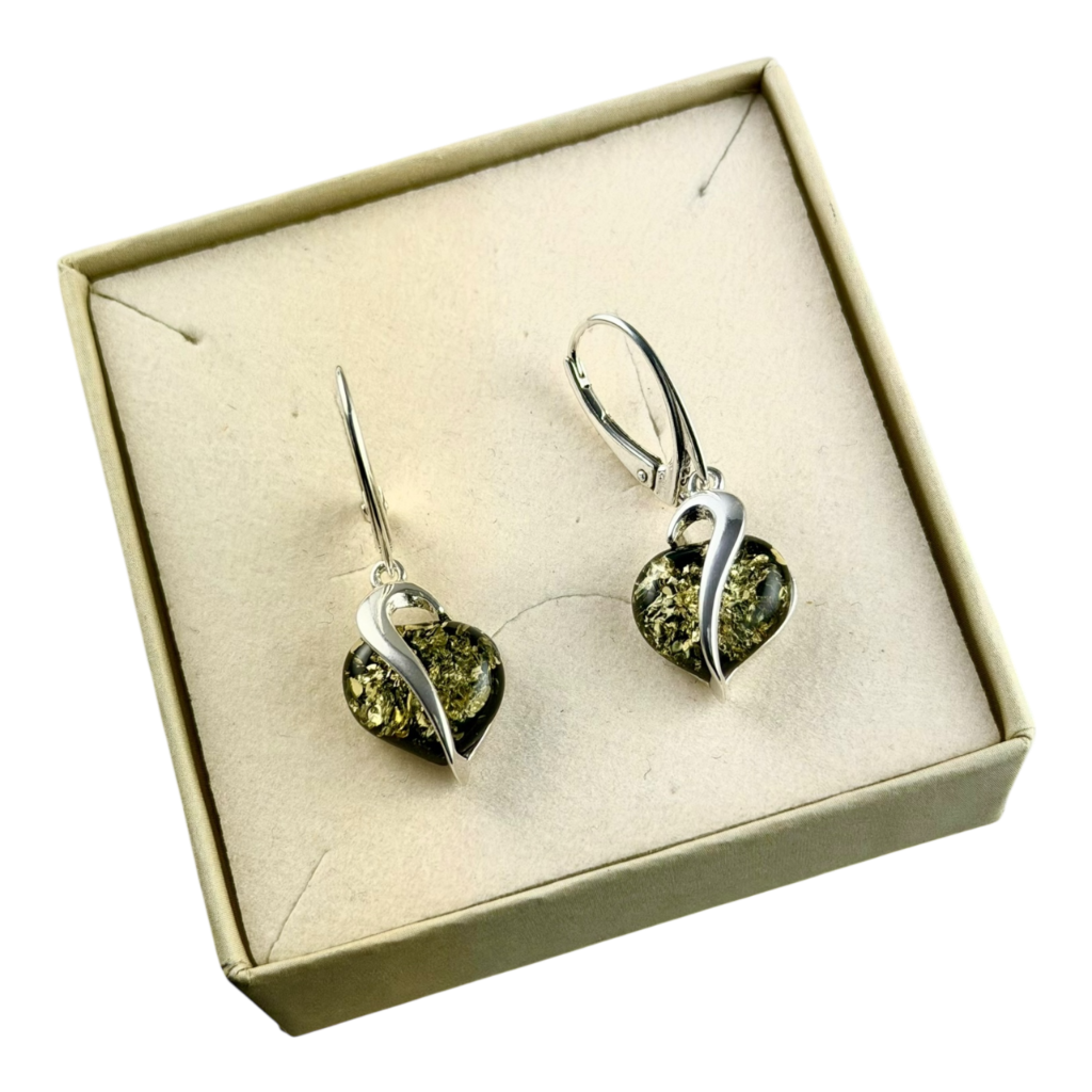 Kolczyki srebrne serduszka z bursztynem – wiszące