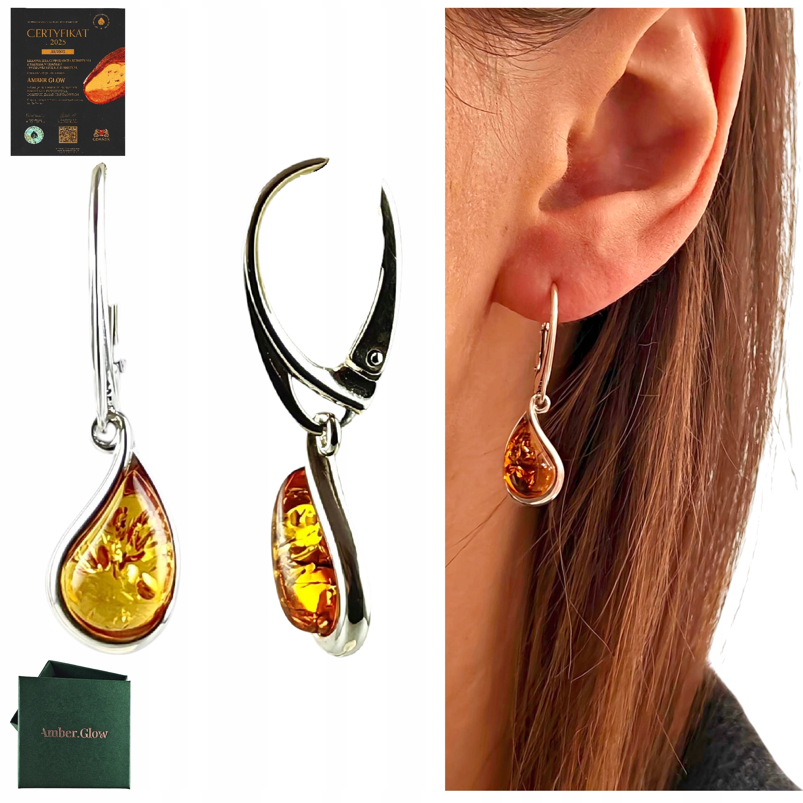 KOLCZYKI SREBRNE z CERTYFIKOWANYM Bursztynem Zapięcie Angielskie PIĘKNE