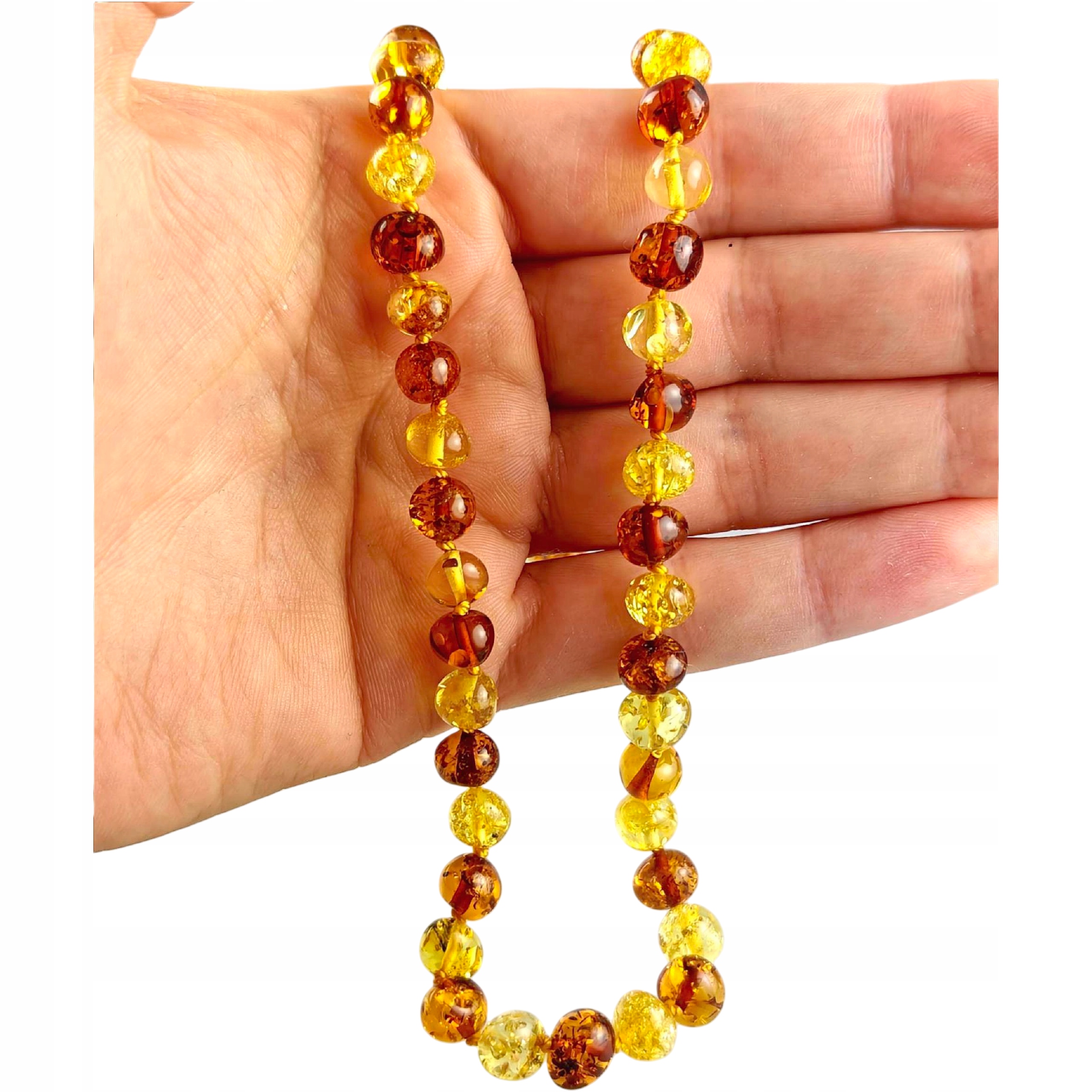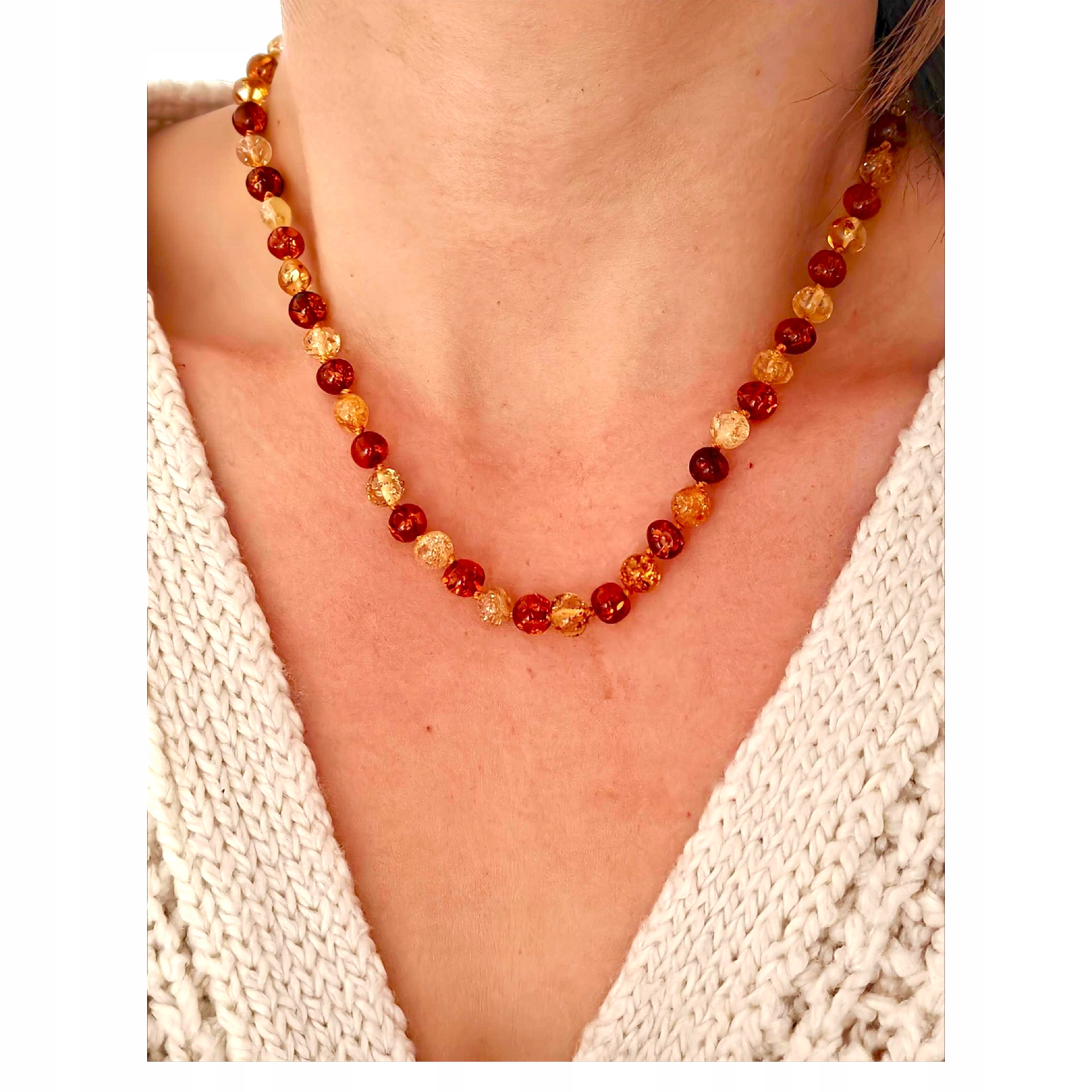 Ten elegancki naszyjnik z naturalnego bursztynu bałtyckiego to propozycja dla osób ceniących ponadczasową biżuterię z duszą. Wykonany z wysokiej jakości, ręcznie szlifowanych koralików bursztynu w głębokim koniakowym odcieniu, zachwyca swoją ciepłą barwą, naturalnym blaskiem i niepowtarzalnym charakterem.