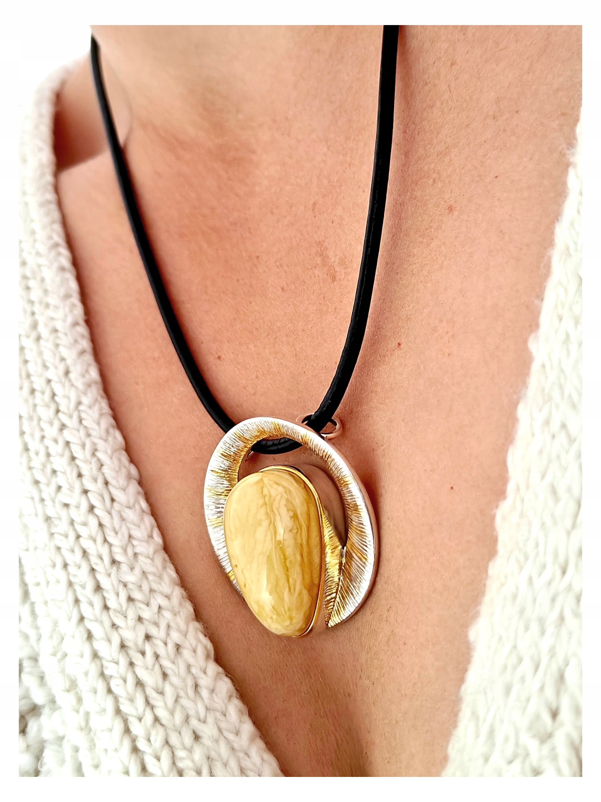 Wyróżnij się z tłumu dzięki tej unikatowej zawieszce, która łączy w sobie naturalne piękno bursztynu z nowoczesnym designem. Centralnym elementem biżuterii jest polerowany bursztyn w ciepłym, miodowym odcieniu