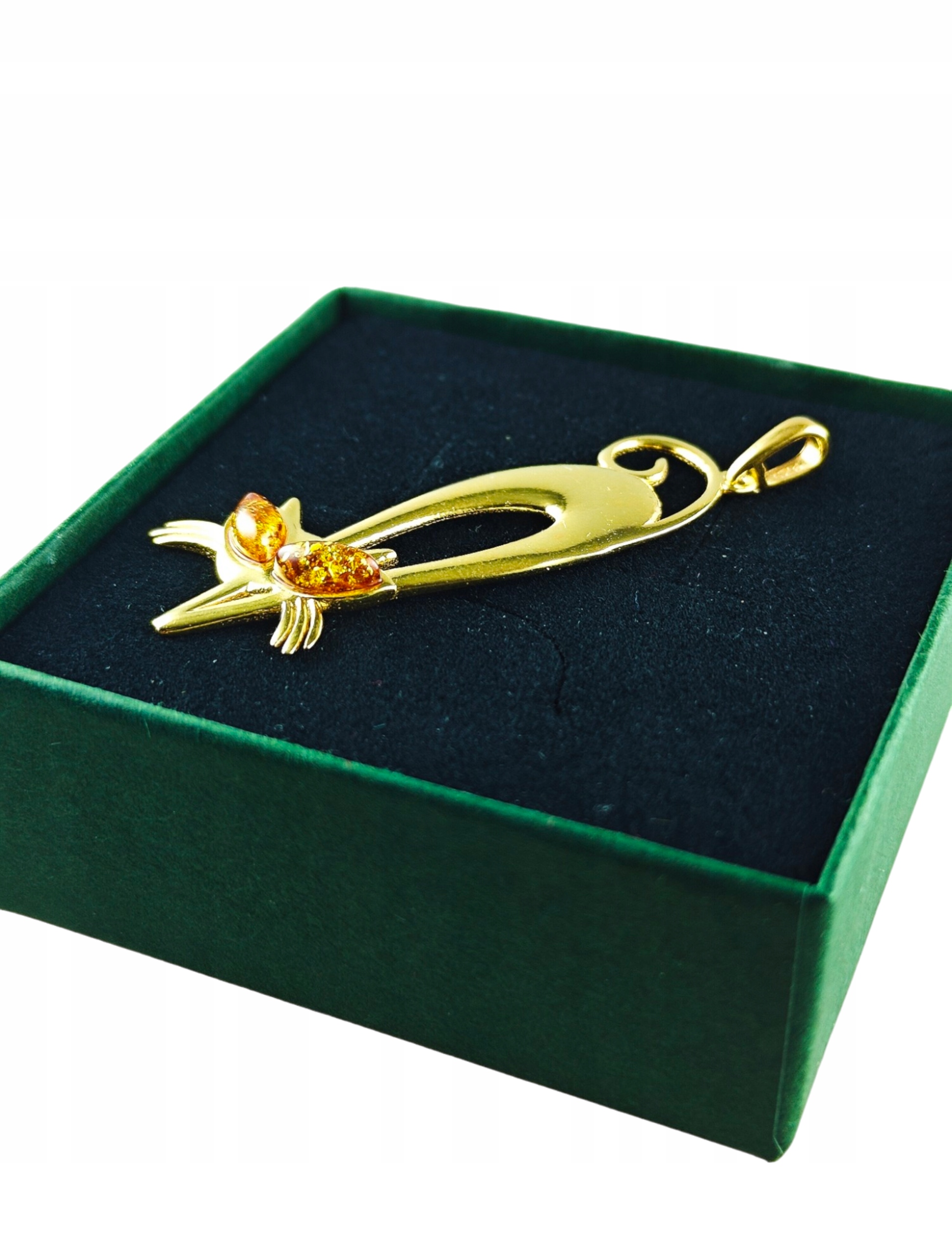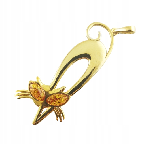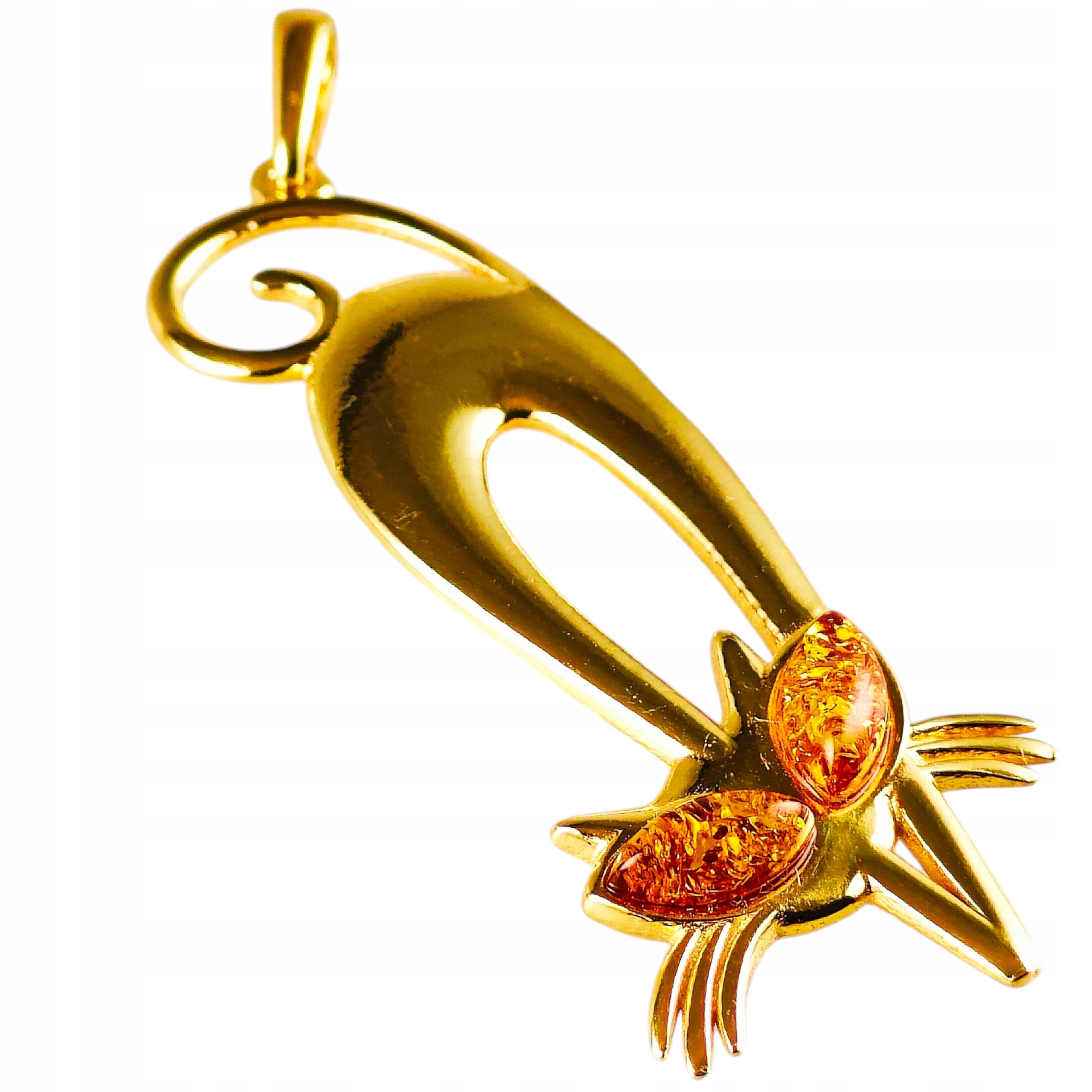 Wisiorek SREBRNY POZŁACANY KOT KOTEK delikatny z bursztynem bałtyckim AG925