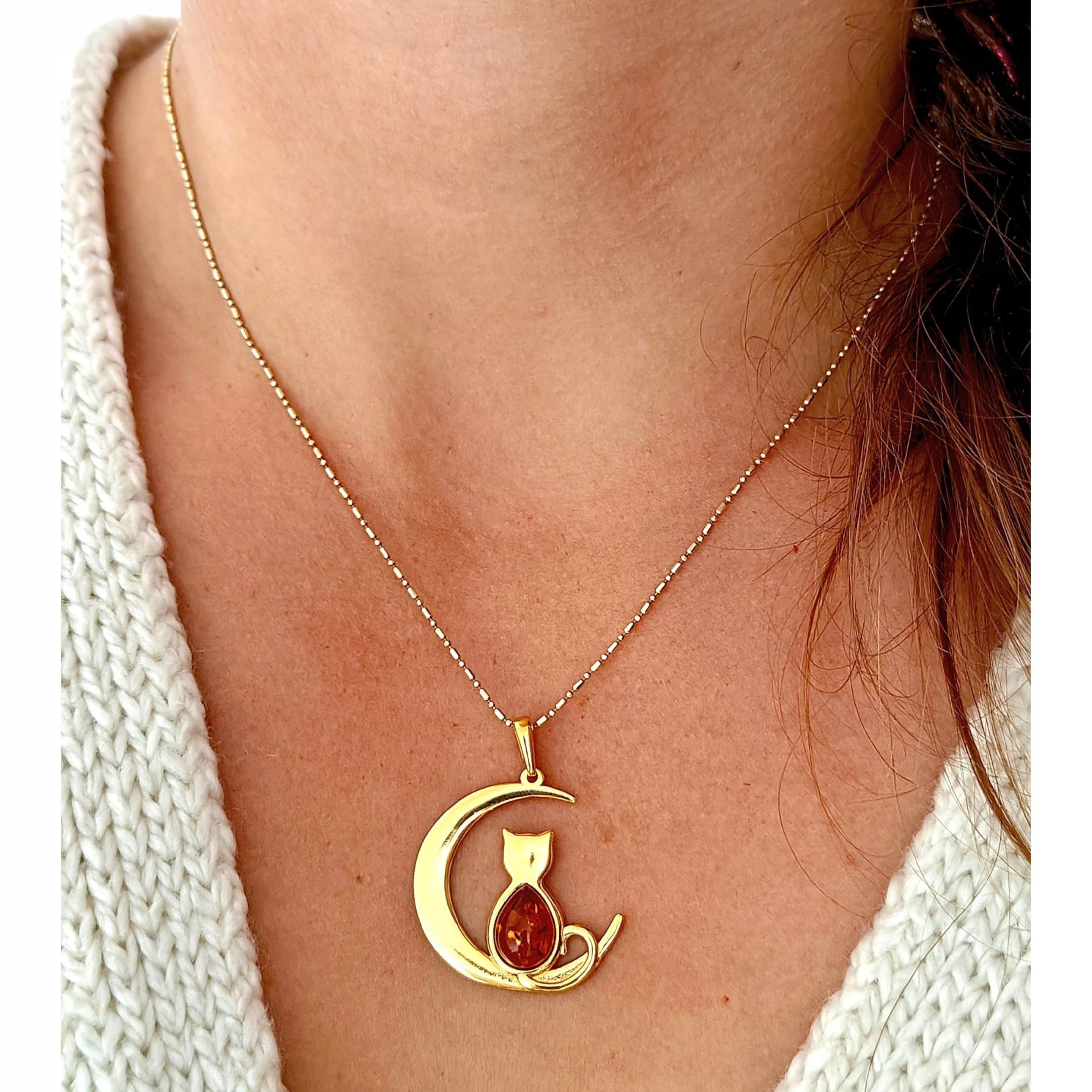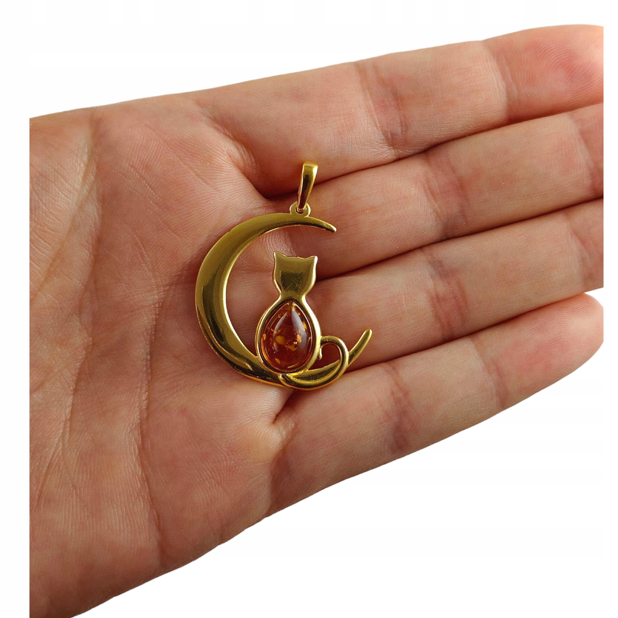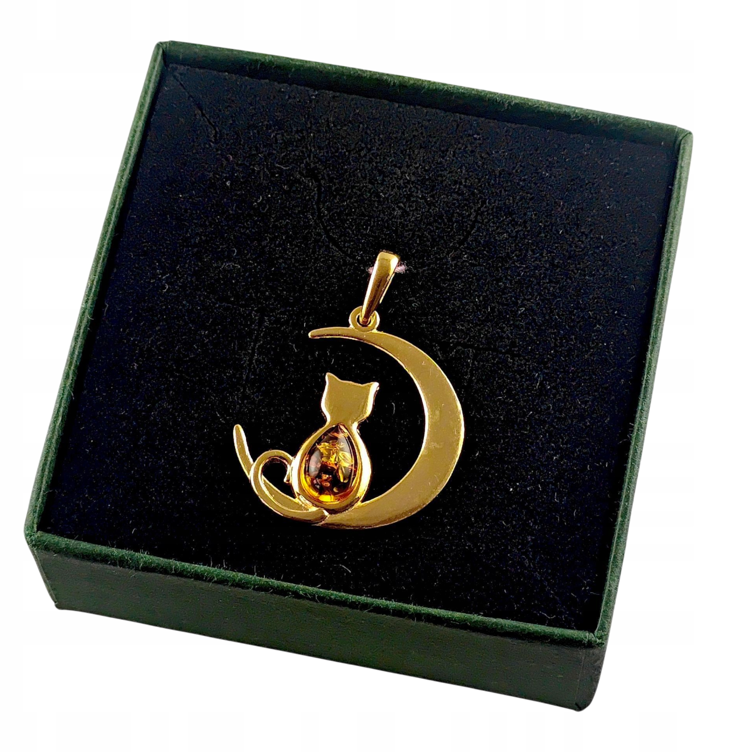 WISIOREK ZŁOTY z CERTYFIKOWANYM Bursztynem KOT Piękny Srebro Pozłacane 925